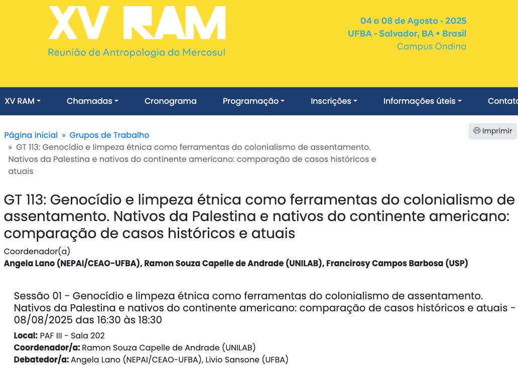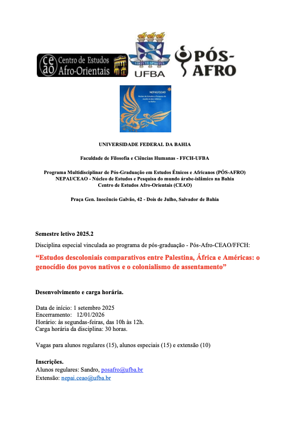 Disciplina NEPAI/CEAO (Pós-Afro): “Estudos descoloniais comparativos entre Palestina, África e Américas: o genocídio dos povos nativos e o colonialismo de assentamento”