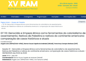 Sessão 01 – Genocídio e limpeza étnica como ferramentas do colonialismo de assentamento. Nativos da Palestina e nativos do continente americano: comparação de casos históricos e atuais – 08/08/2025 das 16:30 às 18:30Local: PAF III – Sala 202 |